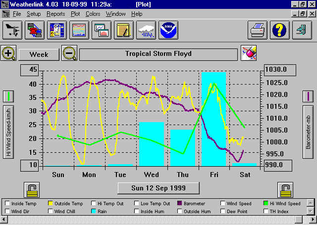 Notice the barometric pressure drop (storm system approaching), the warmer overnight temperatures (Tuesday, Wednesday and Thursday night), and the wind and rain (highest during Friday) as the system passed by Nova Scotia.